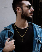 Package includes 1pcs gold-plated stainless steel cross pendant with durable chain (3mm width, 55cm/21.6in length + 5cm extension, 43×21mm pendant, 15g weight).